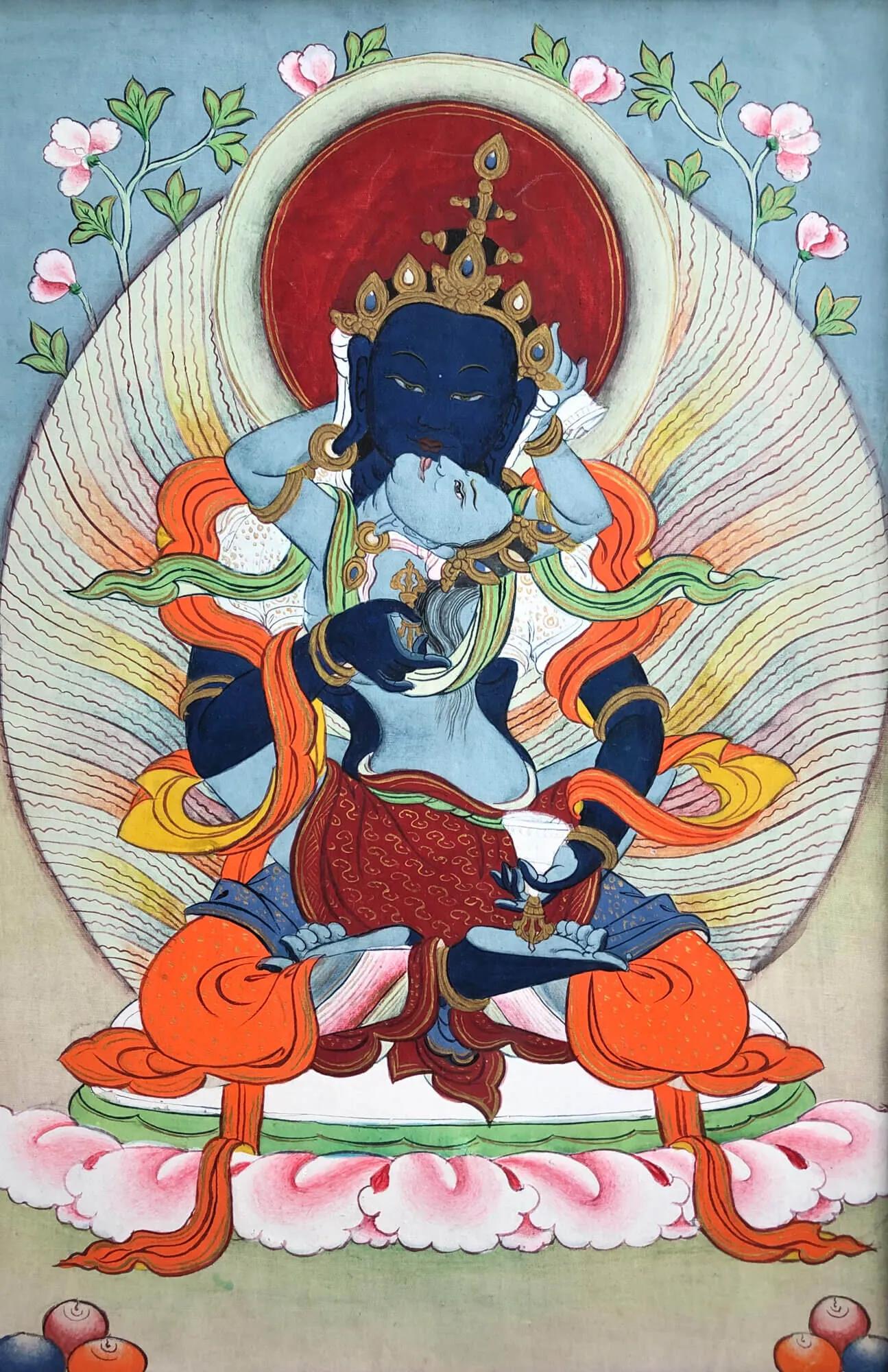 “One night I found myself, as it were, out of the body and in the presence of Amitābha, the Buddha of Infinite Light, who presides over the western quarter of the universe. The colour of the Buddha was a deep, rich, luminous red, like that of rubies, though at the same time soft and glowing, like the light of the setting sun. While his left hand rested on his lap, the fingers of his right hand held up by the stalk a single red lotus in full bloom and he sat, in the usual cross-legged posture, on an enormous red lotus that floated on the surface of the sea. To the left, immediately beneath the raised right arm of the Buddha, was the red hemisphere of the setting sun, its reflection glittering golden across the waters.